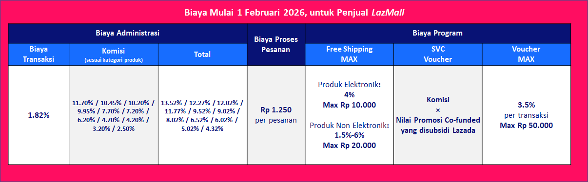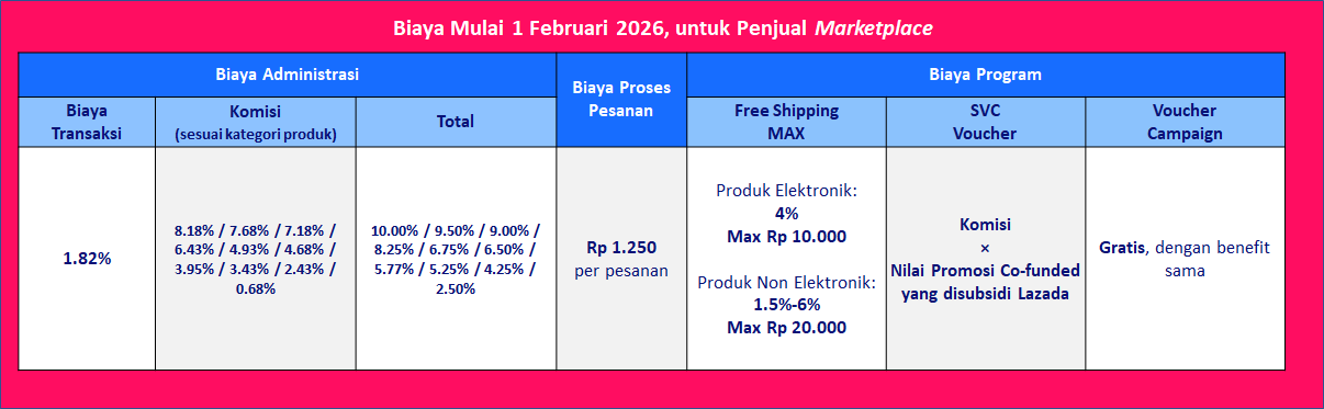 Untuk membantu penjual memahami gambaran biaya secara menyeluruh, berikut adalah rincian biaya resmi Lazada yang berlaku efektif 1 Februari 2026.